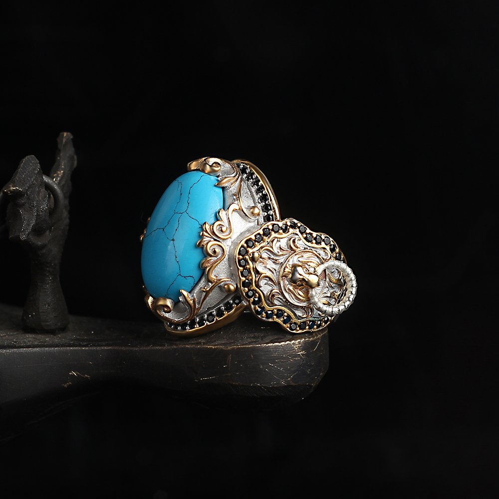 Herren 925 Silber Löwe Ring Türkis Vergoldet
